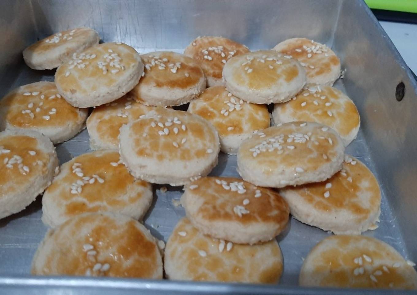 - Ratakan dengan roller dan cetak sesuai selera, olesi bagian atas dengan campuran kuning telur dan minyak lalu beri sedikit wijen