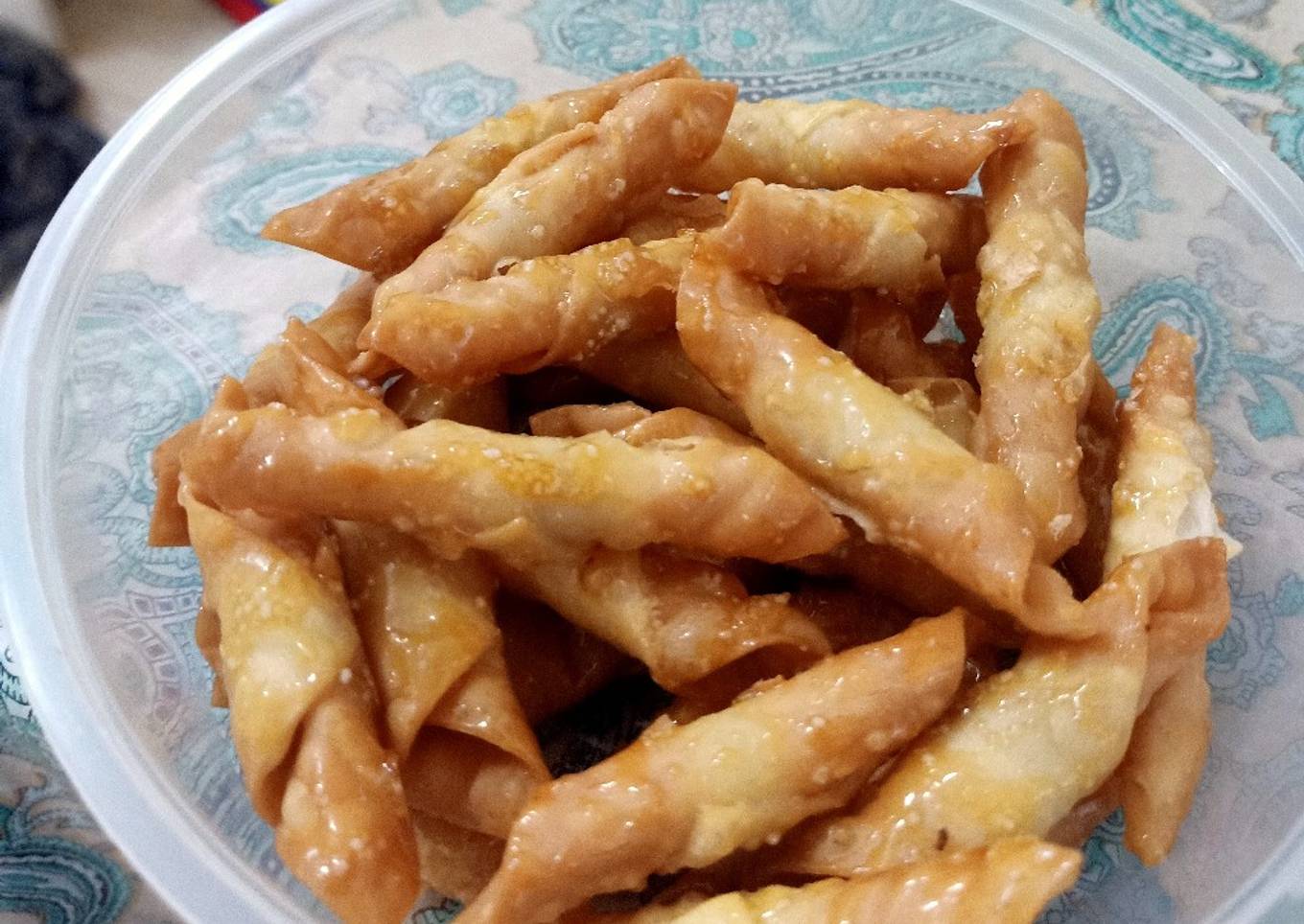 - Gulungkan kacang ke dalam kulit pangsit dan rekatkan dg tepung yg sudah cair. lakukan berulang sampai adonan habis.
