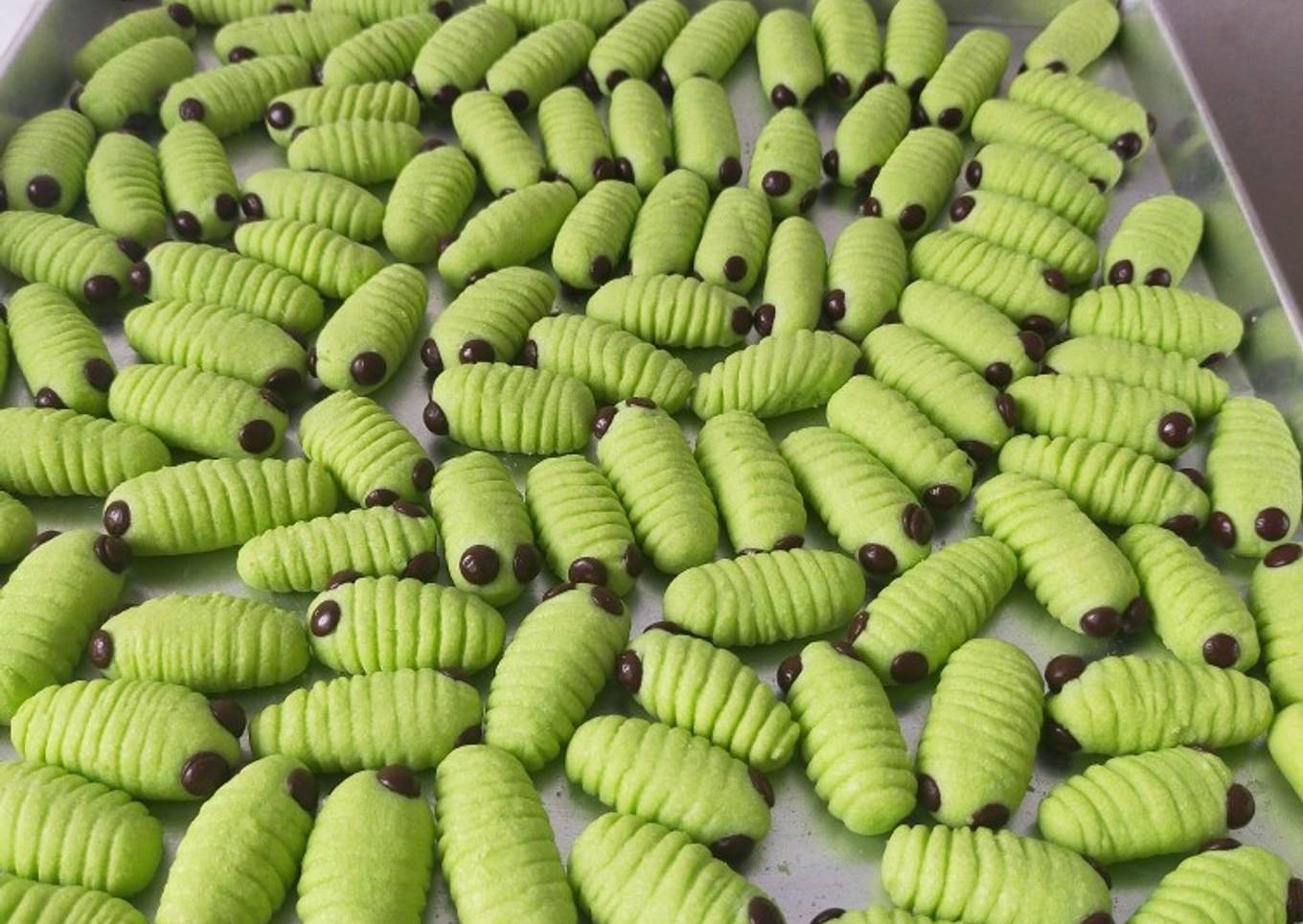 Setelah teraduk semua bahannya bagi adonan kecil2 dan gulung pakai sisir atau garpu dan kasih chocochips untuk matanya.