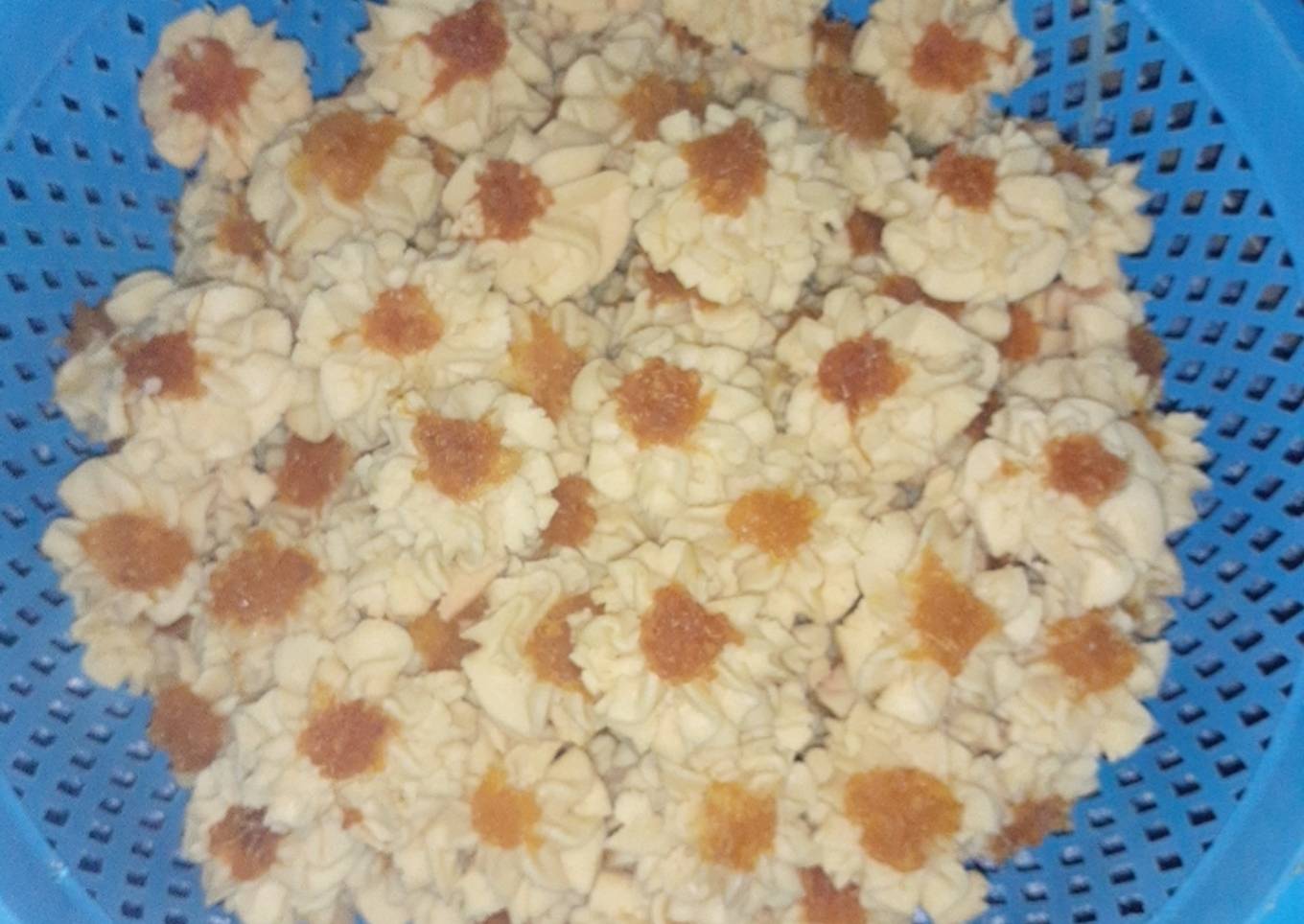 - Ambil sedikit adonan,, bulatkan dan masukan ke dalam cetakan kue semprit sambil sedikit di tekan dengan jempol... beri topping selai nanas.. lakukan seperti itu sampai adonan habis...