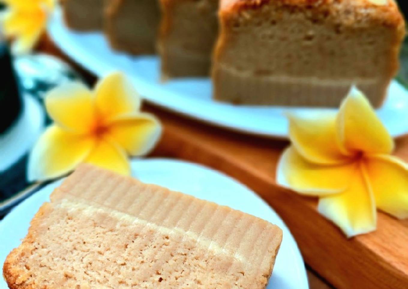 Rasanya enak. Mantap. Teksturnya seperti puding kue. Lembab dan lembut. Manisnya bisa disesuaikan. Yang suka susu, air di bahan B bisa diganti dengan susu cair dan lebih mantap ditaburi almond.
