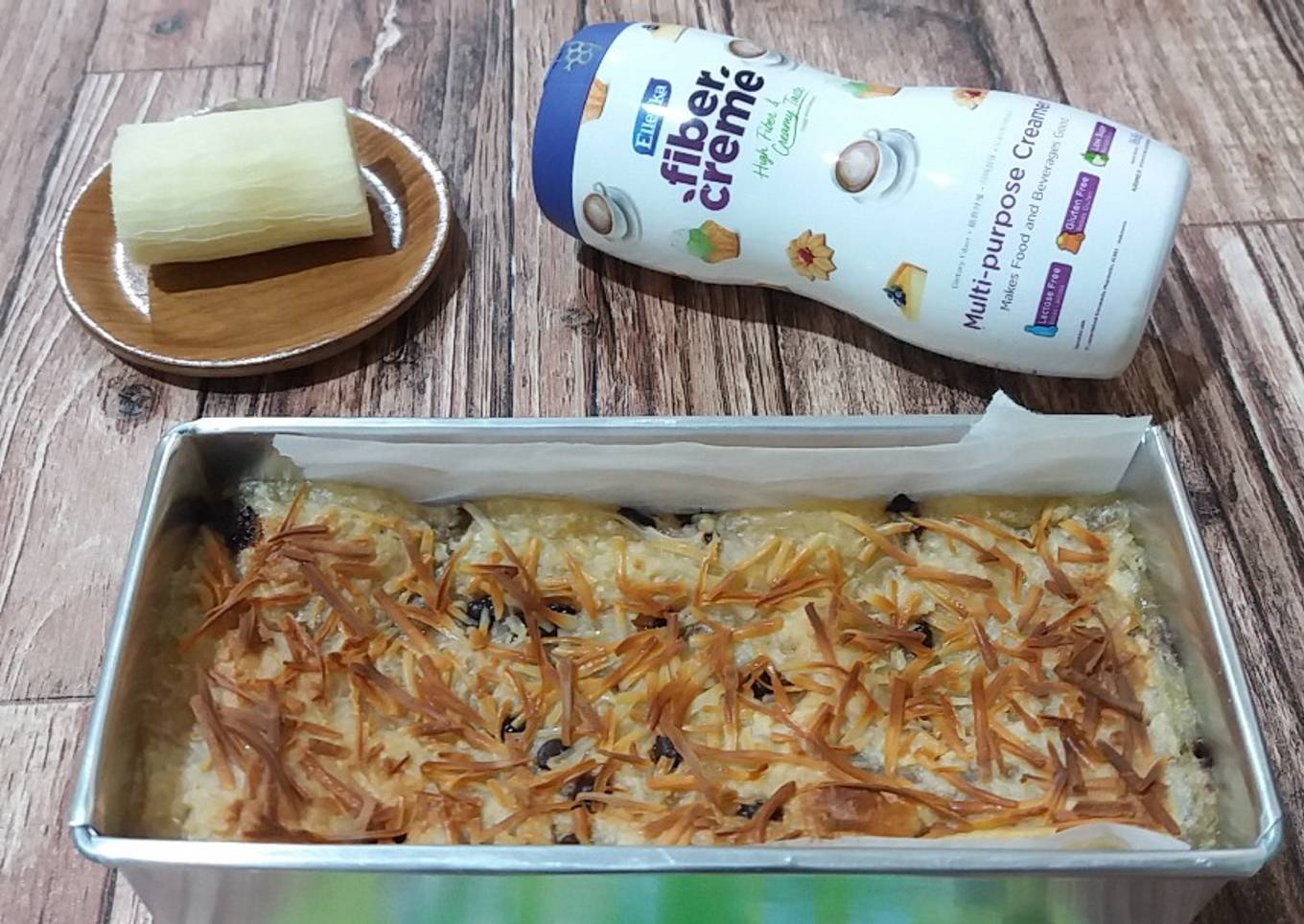- Aduk semua bahan hingga tercampur rata, masukkan ke loyang, padatkan, taburi keju parut