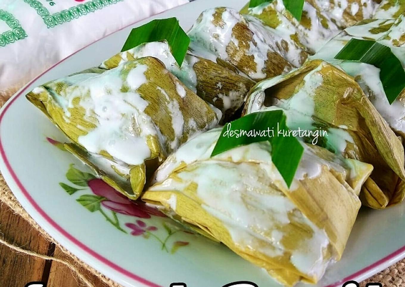 - Ambil 1 lembar daun pisang dibuat oval atau bulat. Olesi dengan minyak goreng ke semua sisi (biar nanti lapeknya tidak lengket) letakkan adonan kulit, pipihkan dan letakkan untinya, bulatkan dan siram dengan santan kental 1 sdm